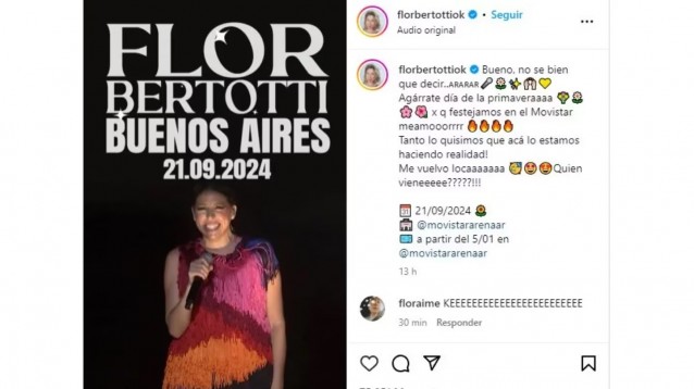 “Yo pensaba ahorrar en 2024 pero Flor Bertotti anunció show en Buenos Aires”, “Solo me mantiene el pie el show de Floricienta”, “Voy a explotar de la felicidad”, “Pelearé con quien sea necesario por esa entrada”, “Mi yo de 5 años está feliz de que va a volver a cantar las canciones de Floricienta en un show”, fueron otras de las reacciones de los fans.
