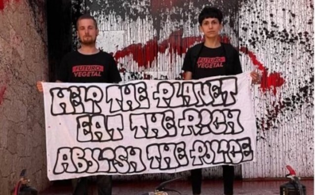 Miembros del grupo Futuro Vegetal divulgaron un video frente a la casa cerca de Cala Tarida, en la costa oeste de Ibiza, con una pancarta con la leyenda, en inglés, "Ayuden al planeta, cómanse un rico", decía el cartel que cerraba con "abolir la policía".