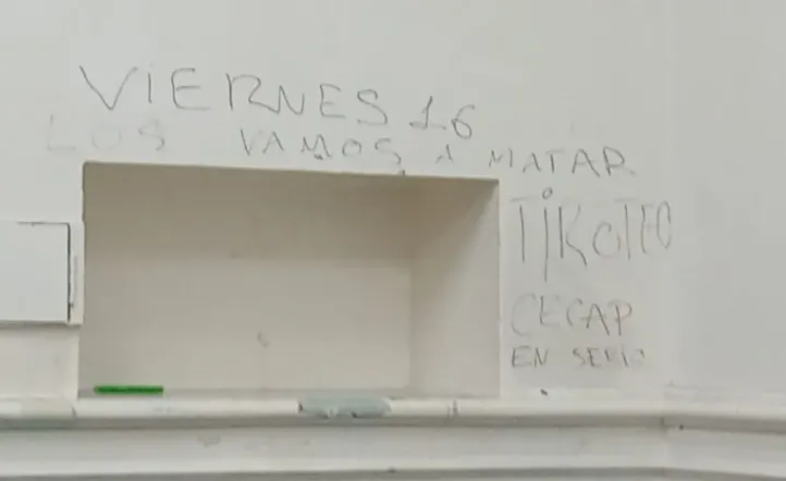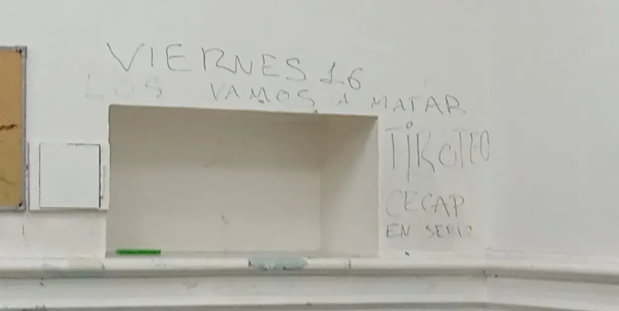 Aunque no trascendió el lugar exacto en el que se encontraron las pintadas, a través de las redes se viralizó una imagen de lo que parecería ser un hueco en la pared sobre el que aparecen las palabras "viernes 16 los vamos a matar, tiroteo CECAP en serio". La amenaza va en línea con las que varias escuelas de todo el país vienen recibiendo desde el lunes, en el que también se prometen disparos para esta semana.