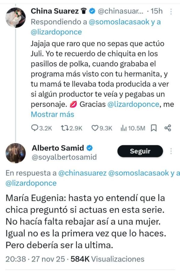 La reacción de La China Suárez al comentario de Poggio rápidamente se viralizó, sumándose a otras situaciones en las que la actriz respondió de manera directa a comentarios que consideró desubicados o provocadores. Por eso, cuando Samid escribió que “no es la primera vez”, muchos usuarios interpretaron que hacía referencia a esos antecedentes.