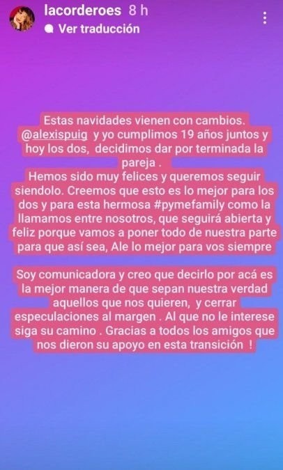 “Estas navidades vienen con cambios. Alexis Puig y yo cumplimos 19 años juntos y hoy los dos decidimos dar por terminada la pareja”, señaló por su parte Lola Cordero, también en una story de Instagram.