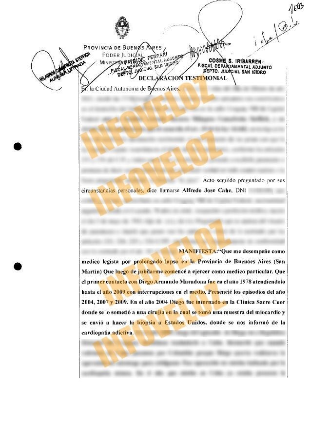 El Dr. Alfredo Cahe conoce como pocos la salud de quien fuera su paciente más famoso y además estuvo presente en la Clínica Olivos cuando lo operaron a Diego. Por ese motivo los fiscales lo llamaron a testimoniar y de esa declaración, a la que INFOVELOZ accedió de manera exclusiva, se desprenden datos que complican tanto a Luque, Cosachov como a los enfermeros.