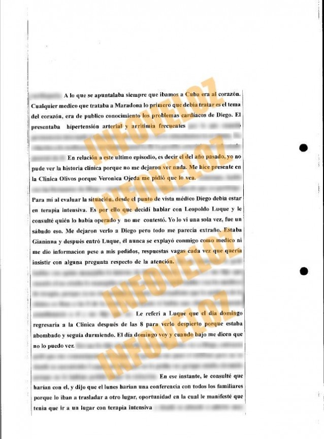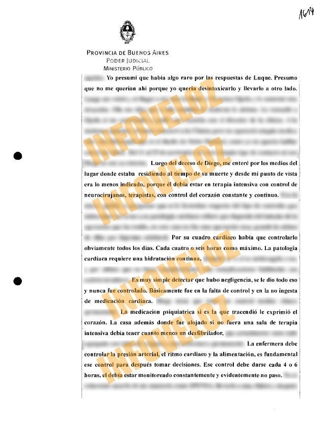 Sobre la muerte en sí, y el lugar y las condiciones de la “internación”, Cahe fue contundente: “Luego del deceso de Diego, me enteré por los medios del lugar donde estaba residiendo al tiempo de su muerte y desde mi punto de vista era lo menos indicado, porque él debía estar en terapia intensiva con control de neurocirujanos, terapistas, con control del corazón constante y continuo”.