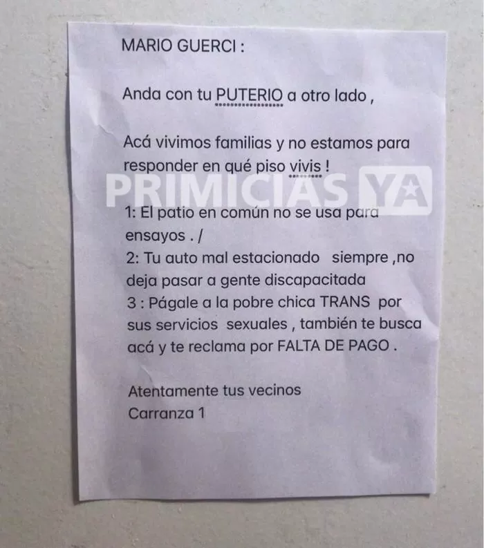 "Andá con tu puterío a otro lado": la tremenda nota que le dejaron a Mario Guerci sus vecinos
