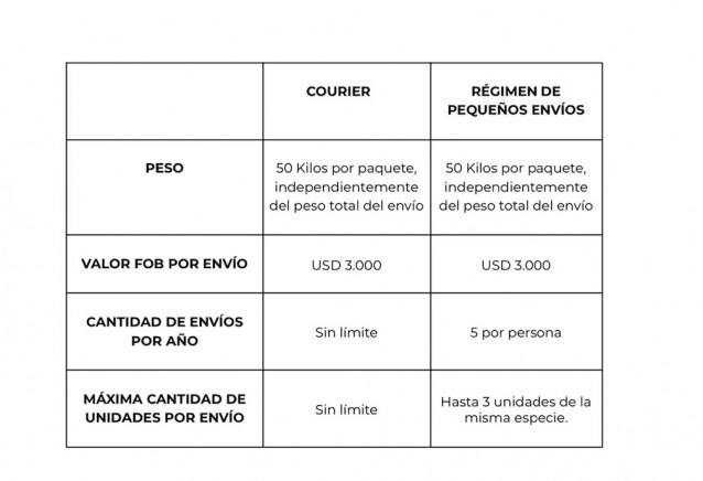 Con la nueva disposición, se podrán traer, por ejemplo, 3 paquetes de 50 kilos en un mismo envío. Es decir, el tope de 50kg se mantiene pero por paquete, no por envío. De la misma manera, el cupo de cinco envíos por año por persona puede ser de 50 kilos por paquete las cinco veces. Y no ser un límite acumulable en el año.