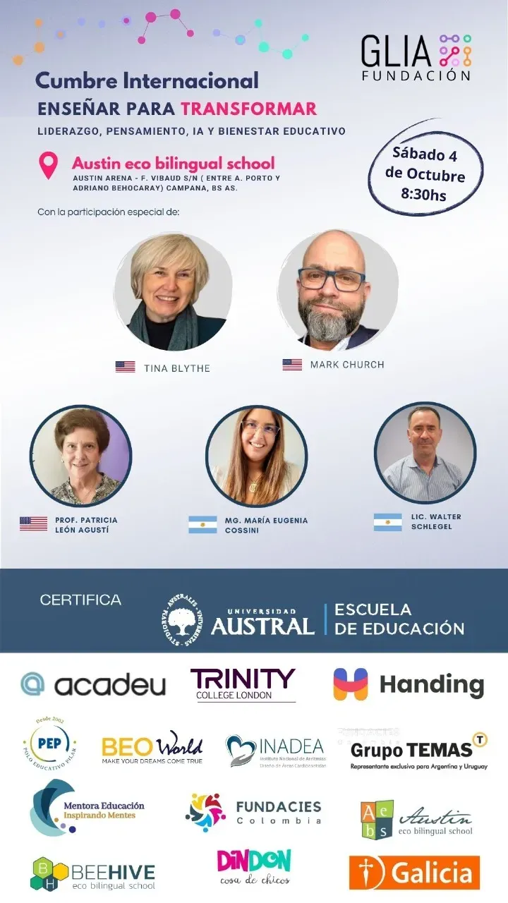 Organizada por la consultora educativa GLIA, en alianza con Austin Eco Bilingual School, y con el aval académico de la Facultad de Educación de la Universidad Austral, la Cumbre reunirá a figuras internacionales de primer nivel, entre ellas los reconocidos especialistas de Harvard Project Zero, Tina Blythe y Mark Church, referentes globales en pensamiento visible y culturas de aprendizaje profundo.
