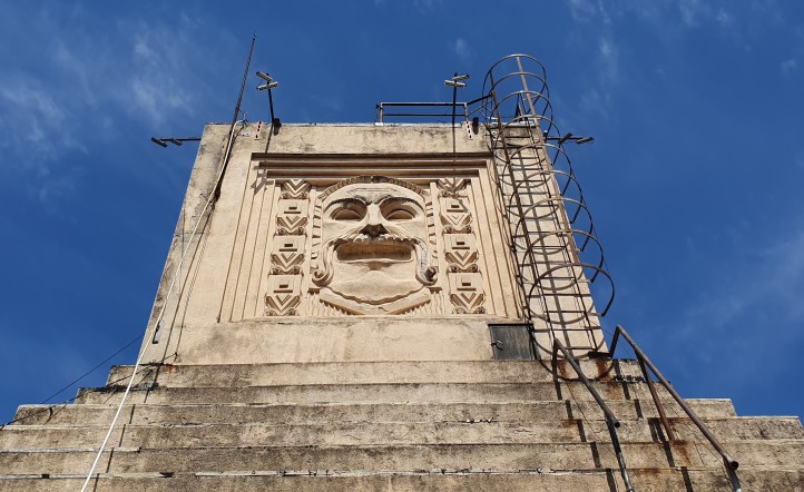 Una de las características más icónicas de este edificio es la pirámide escalonada de estilo incaico que deja verse desde la Avenida Santa Fe. Allí, se observa una interpretación libre que hizo Virasoro de las máscaras que representan el drama y la comedia ya que es la misma figura en las cuatro caras del cubo con que remata el edificio.