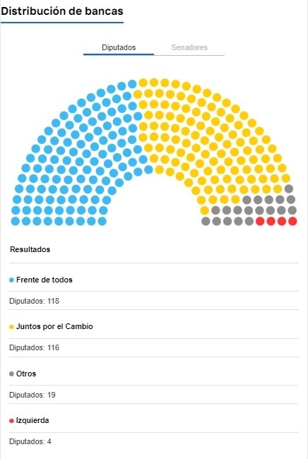 De esta manera, el oficialismo quedó con 35 legisladores, a dos del quorum, lo que obligará a la vicepresidenta Cristina Kirchner a negociar con otros espacios para dar impulso a la sanción de las leyes de la Casa Rosada. Las cifras marcan, además, que el Congreso quedará polarizado a partir de diciembre.