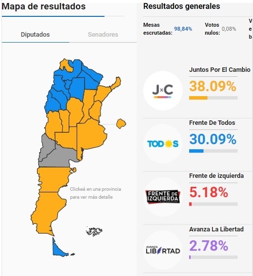 A nivel país, en la categoría de Diputados, Juntos cosechó el 38,08% de los votos, mientras que el Frente de Todos obtuvo el 30,06%. Por su parte, en cuanto a la lucha por las bancas del Senado, a nivel país Juntos reunió el 40,05% de los sufragios, contra los 26,11% del oficialismo.