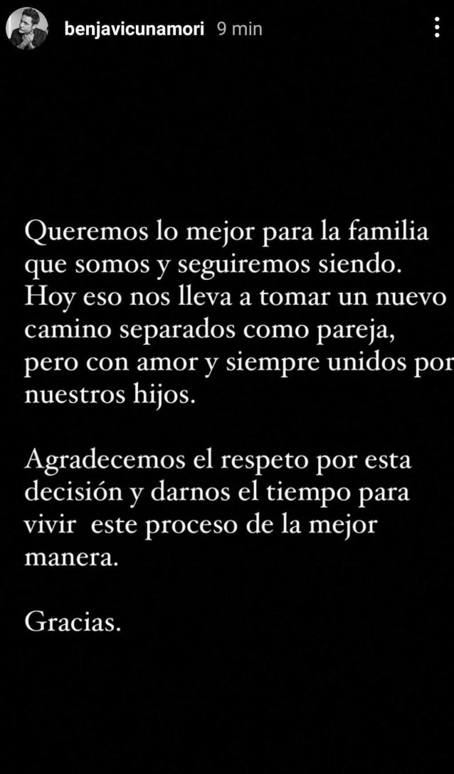 “Queremos lo mejor para la familia que somos y seguiremos siendo. Hoy eso nos lleva a tomar un nuevo camino separados como pareja, pero con amor y siempre unidos por nuestros hijos”, comenzó diciendo el galán chileno.
