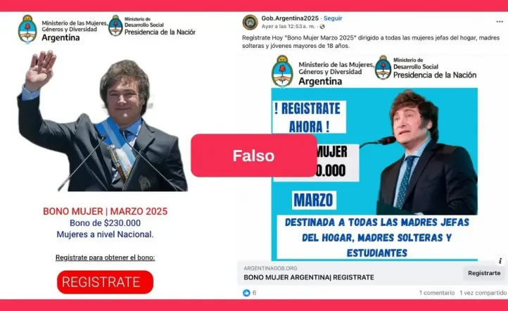 Las publicaciones incluyen una imagen que muestra la fotografía del presidente Javier Milei (La Libertad Avanza) y los logos de 2 ministerios. Debajo, aparece un link que redirige a una supuesta página web oficial para inscribirse al beneficio.