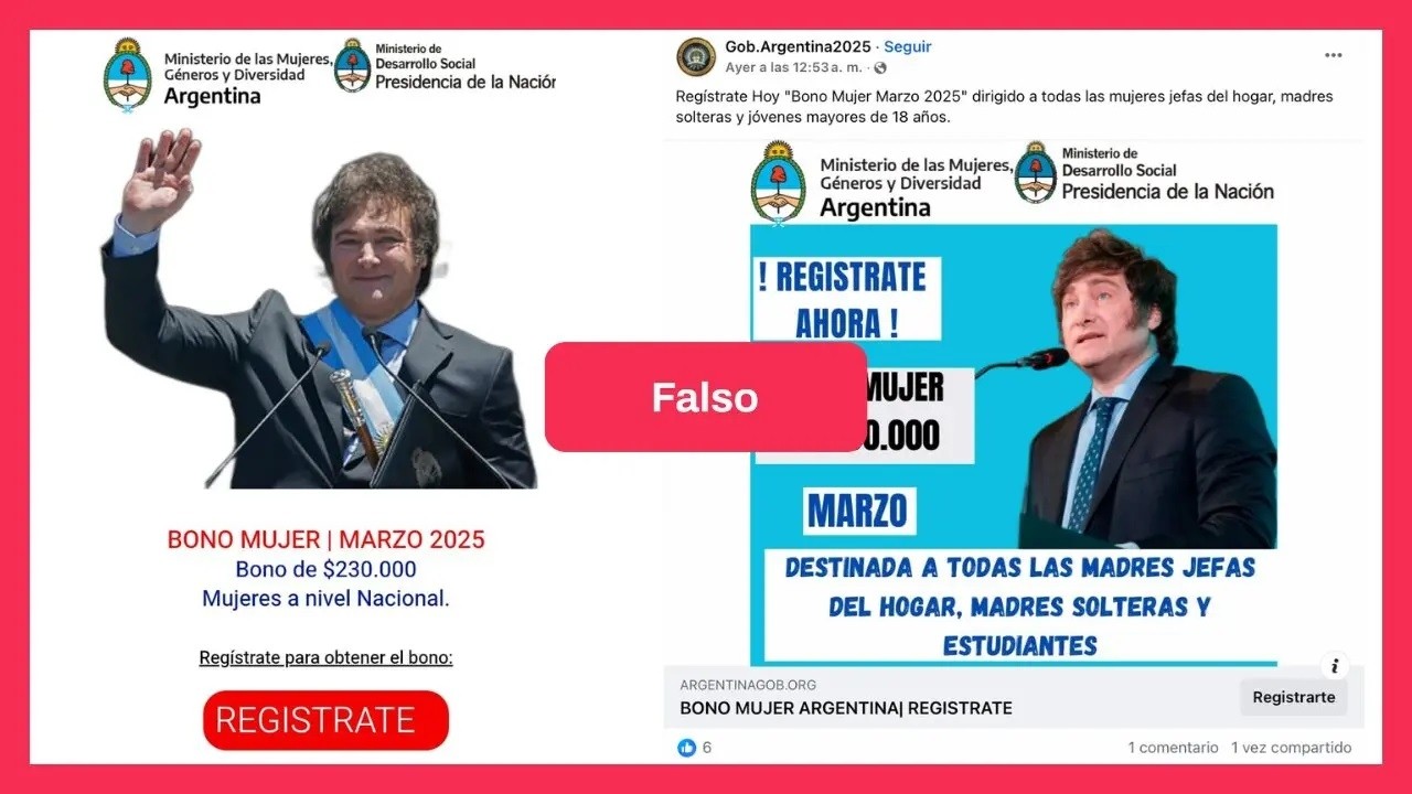 “Ya Disponible! Bono Mujer Marzo 2025 para todas las mujeres en Argentina, jefas del hogar, madres solteras y jóvenes. Entre 18 a 60 años”. Con mensajes como este, distintos posteos en Facebook y cadenas en WhatsApp promocionan un presunto “Bono Mujer” de $ 230 mil que sería entregado por el Gobierno nacional en marzo de 2025.