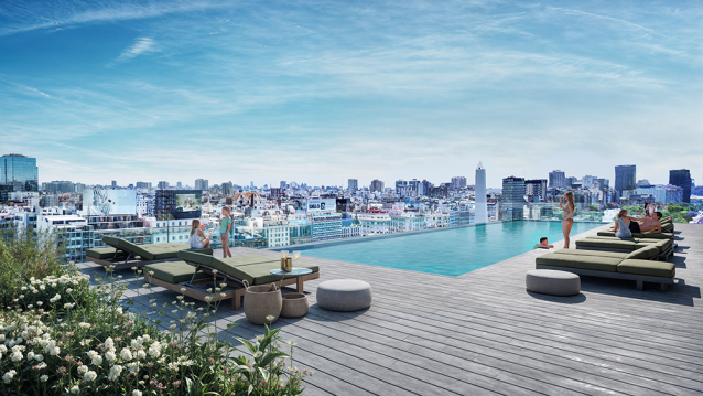 El edificio contará con amenities como una pileta cubierta y otra al aire libre ubicada en la terraza, con bordes infinitos y vista al obelisco, gimnasio, health center, un área de coworking, sala de reuniones, salón de usos múltiples, rooftop bar de acceso libre con la mejor vista a la ciudad, preconexión para auto eléctrico en cada cochera, guarda bicicletas y bauleras.
