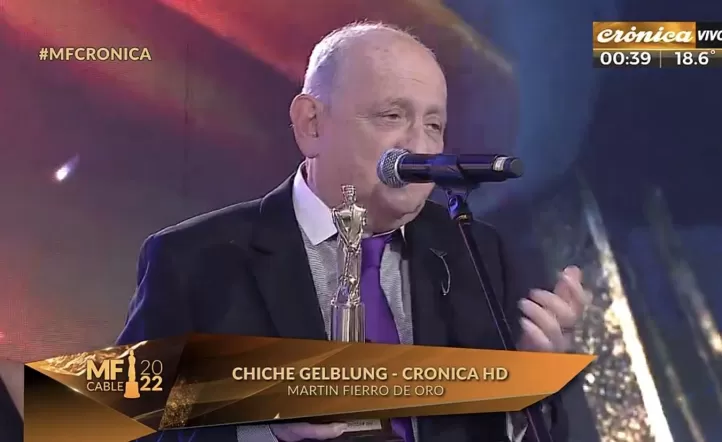 Samuel Chiche Gelblung recibió el galardón más importante de la noche de manos de Luis Ventura y sus compañeros de Crónica entonaron canciones en su honor en un momento muy emotivo. “Empecé de viejo en la televisión, esto es demasiado reconocimiento, este es el mayor premio que puedo tener. Gracias a mis compañeros, a mi compañera de toda la vida, Cristina (Seoane), a mis hijos y nietos, esto es demasiado premio”, expresó el periodista visiblemente emocionado.