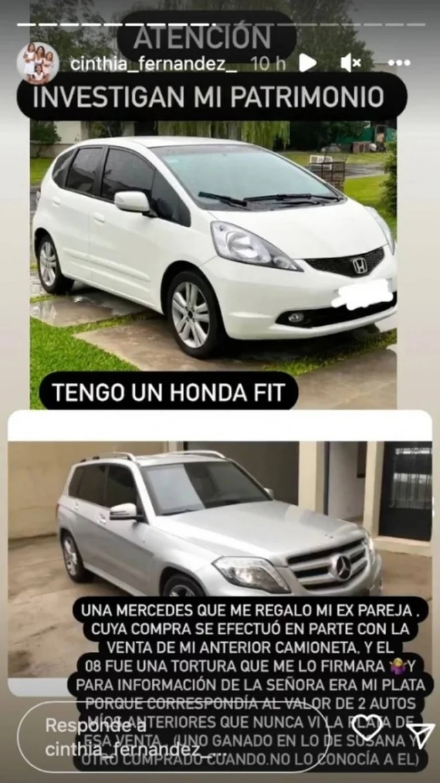 Frente a esta grave acusación, la panelista de “Momento D” (El Trece) decidió revelar su patrimonio en unas historias que publicó en su cuenta oficial de Instagram. “Investigan mi patrimonio. Tengo un Honda Fit y una Mercedes que me regalo mi expareja, cuya compra se efectuó en parte con la venta de mi anterior camioneta, y el 08 fue una tortura que me lo firmara”, señaló Cinthia y mostró imágenes de los vehículos.