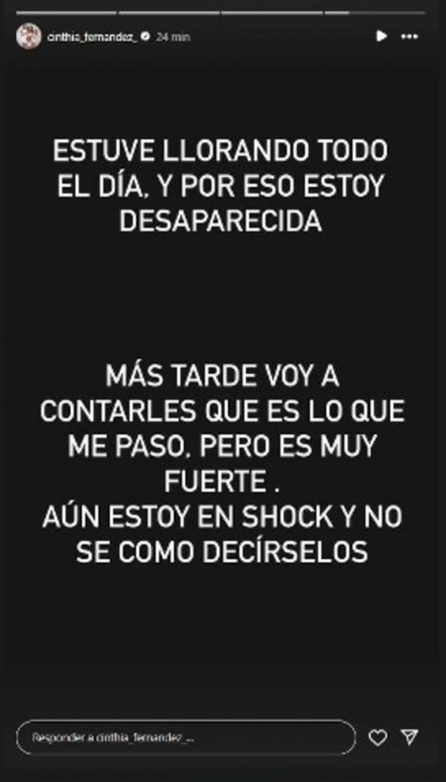 En un principio, Cinthia había preocupado a sus seguidores con un alarmante mensaje en Instagram. “Estuve llorando todo el día, y por eso estoy desaparecida”, contó la bailarina.