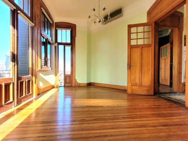 El departamento en cuestión tiene siete ambientes en una superficie total de 219 m2. Está ubicada en el tercer piso al frente en esquina con balcones sobre Ayacucho y Rivadavia.