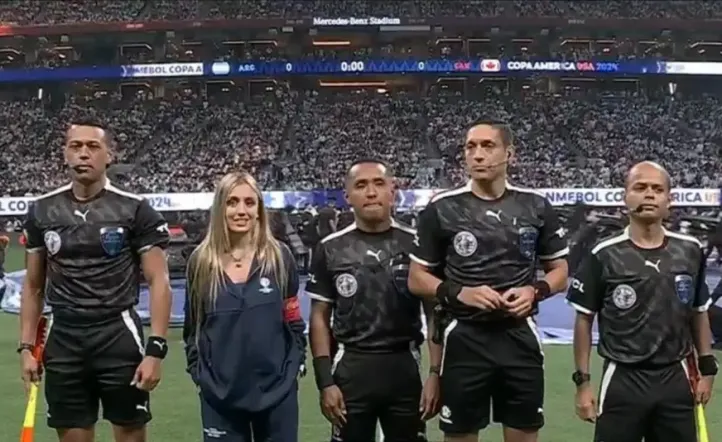 Un curioso momento se vivió anoche antes del partido Argentina-Canadá en la inauguración de la Copa América 2024 cuando entre los árbitros apareció Morena Beltrán, la periodista de ESPN.