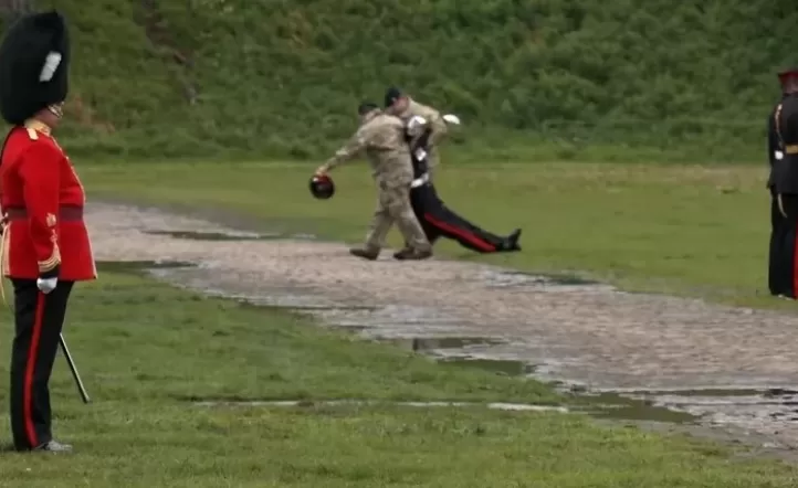 En las imágenes se puede ver cómo el soldado cae al suelo de manera repentina. Mientras sus compañeros continúan con los ejercicios protocolares, dos militares se acercan para levantarlo y trasladarlo para que reciba atención médica.