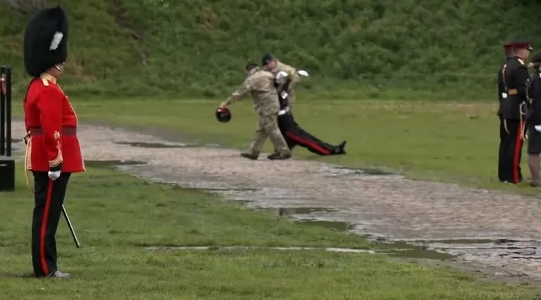 Un guardia real que se encontraba cerca del féretro comenzó a balancearse, se descompensó y cayó tendido sobre el piso de piedra, a pesar de los intentos de su compañero de sostenerlo sin abandonar su puesto.