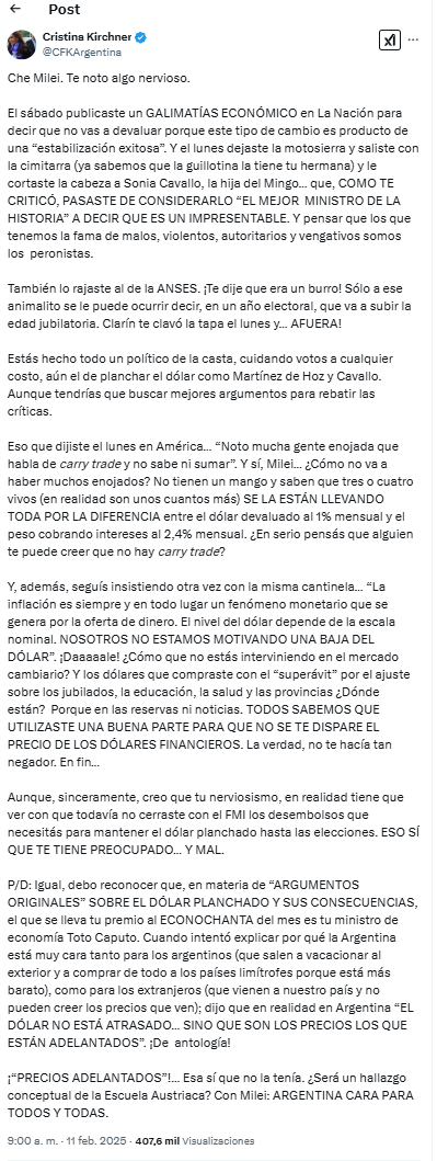 La expresidenta criticó al ministro de Economía: “Cuando intentó explicar por qué la Argentina está muy cara tanto para los argentinos (que salen a vacacionar al exterior y a comprar de todo a los países limítrofes porque está más barato), como para los extranjeros (que vienen a nuestro país y no pueden creer los precios que ven); dijo que en realidad en Argentina ‘el dólar no está atrasado... sino que son los precios los que están adelantados’. ¡De antología! ‘¡Precios adelantados!…' Esa sí que no la tenía. ¿Será un hallazgo conceptual de la Escuela Austríaca? Con Milei: Argentina cara para todos y todas".