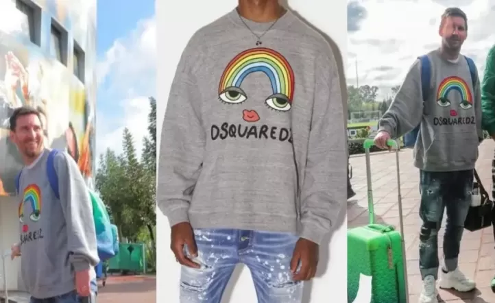 La prenda en cuestión es de la marca Dsquared2, propiedad de los gemelos canadienses Dean y Dan Caten. Según se especifica en la tienda online, el buzo confeccionado en “tejido polar sin cepillar”, es de cuello redondo, mangas largas, ribetes acanalados, bolsillo estilo canguro y un estampado de arcoíris sonriente con el nombre de la marca.