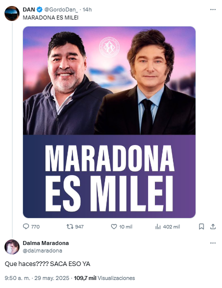 "Maradona es Milei", dice la imagen, donde se vislumbra también un supuesto logo de "Peronistas con Milei". La actriz e hija del Diez no se quedó callada y rápidamente cuestionó la publicación: "Que haces???? SACA ESO YA", le ordenó a Parisini.
