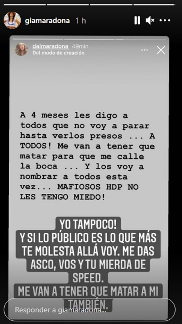 “A cuatro meses les digo a todos que no voy a parar hasta verlos presos... A TODOS!”, expresó Dalma Maradona en una Instagram Story. “Me van a tener que matar para que me calle la boca... Y los voy a nombrar a todos esta vez... MAFIOSOS HDP NO LES TENGO MIEDO!”, cerró.