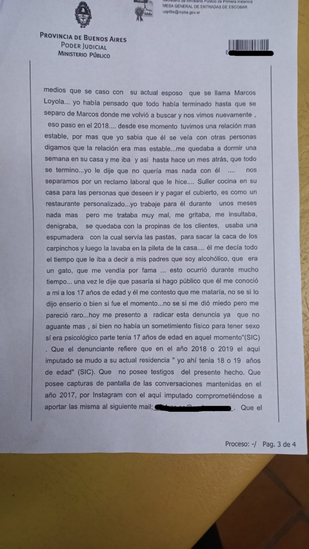 "Me gritaba, me denigraba, se quedaba con las propinas de los clientes y las pastas las colaba con la misma espumadera que usaba para limpiar la caca de los carpinchos. Además, me amenazó con decirle a mis padres que era un alcohólico y que era un gato que me vendía por un poco de fama", completó Acosta. El denunciante mostró conformidad para someterse a las pericias que se requieran, al tiempo que presentó las capturas de las conversaciones que tuvo con Süller.