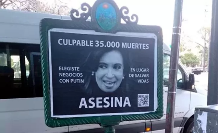Los afiches tienen un fondo negro con la foto de Cristina Kirchner y la acusación sin fundamento a la vicepresidenta de 35.000 muertes: “Asesina, elegiste negocios con Putin en lugar de salvar vidas”.