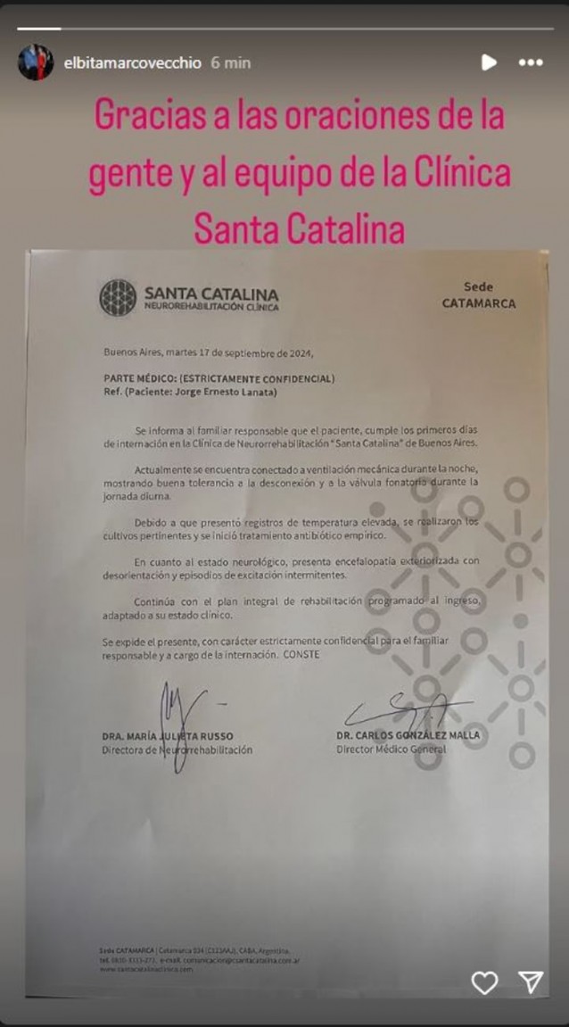 En este contexto, Marcoveccchio aprovecho para agradecer los mensajes de apoyo y cariño recibidos en este último tiempo. “Gracias a las oraciones de la gente y al equipo de la Clínica Santa Catalina”, escribió junto a la foto del parte médico.