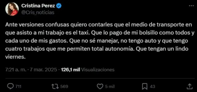 Tras las repercusiones, la conductora de La Nación+ y Radio Rivadavia explicó su situación mediante un mensaje en su cuenta de X. "Ante versiones confusas quiero contarles que el medio de transporte en que asisto a mi trabajo es el taxi. Que lo pago de mi bolsillo como todos y cada uno de mis gastos", comenzó diciendo.