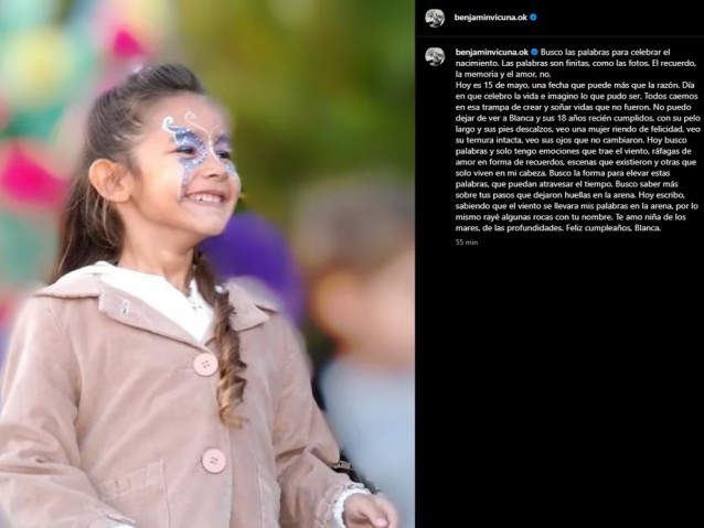 En un emotivo mensaje de cumpleaños lleno de nostalgia y amor, Benjamín Vicuña reflexionó sobre el paso del tiempo y las memorias que persisten a pesar de la ausencia física. El 15 de mayo marca el cumpleaños de Blanca -fruto de su relación con Pampita-, quien hubiera cumplido 18 años. A través de palabras cuidadosamente escogidas, expresó su amor inquebrantable y su deseo de que estas puedan trascender el tiempo.