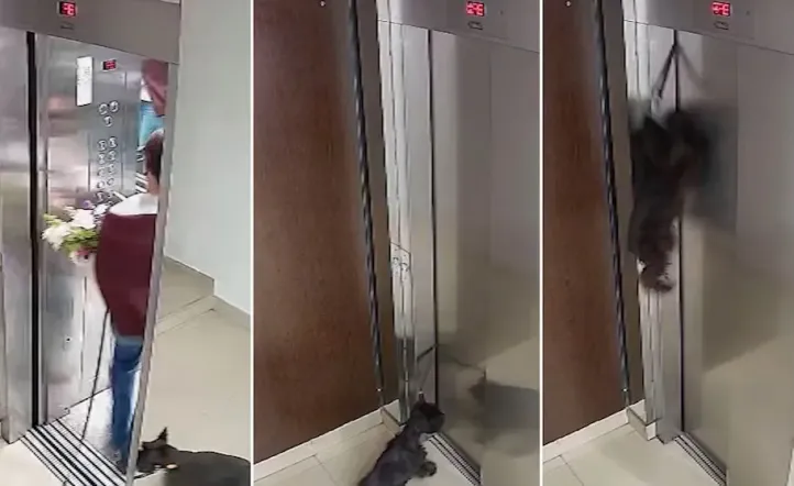 La terrible escena quedó grabada de principio a fin por las cámaras de seguridad del hall de entrada, que registró toda la secuencia: desde que el perro queda afuera del ascensor hasta que finalmente lo rescatan después de quedar inconsciente por la asfixia de su correa.