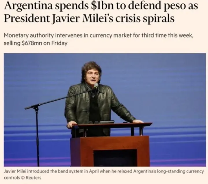 "Argentina gasta 1.000 millones de dólares para defender el peso mientras se agrava la crisis del presidente Javier Milei", se titula el artículo que cuenta que el Banco Central intervino en el mercado de divisas por tercera vez esta semana, vendiendo US$ 678 millones el viernes.