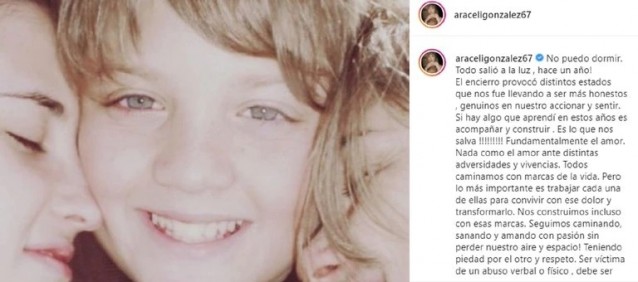 “¡Acá hay mamá, acá hay amor, acá hay nido, acá hay familia, acá hay vida! ¡Sobre todas las cosas vida! abrazar los corazones dañados por abuso de cualquier tipo. Mi valiente y sensible: hablo. Pido respeto. Pido cuidado en sus palabras como lo pediría por cualquier ser humano que se abre a la verdad y tiene la fortaleza de hacerlo público. ¡En el momento que sintió hablarlo, fue genuino! ¡Su vida se construye día a día!” (SIC) sostuvo Araceli.