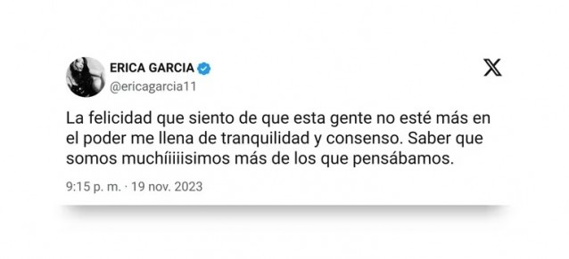 Una de las destacadas mujeres del mundo de la música que se volcó a las redes a expresarse fue Érica García, quien antes de conocerse los primeros números había destacado: “Si gana Milei se mantendrían los resultados de las PASO, por lo tanto la próxima hagamos una elección sola en vez de tres”, para luego afirmar: “El argentino que más está transpirando hasta los resultados finales es el trompetista del Colón”, haciendo referencia a lo ocurrido el último sábado, cuando el ahora Presidente electo se acercó al histórico recinto a disfrutar de la función de Madama Butterfly junto a su novia Fátima Flórez y fuera recibido con cánticos en su contra por una parte del público presente, e incluso por parte de los músicos desde el escenario.