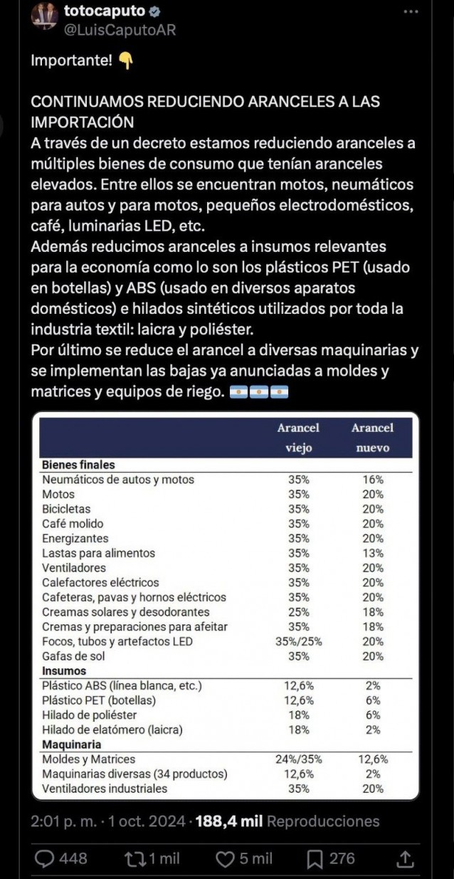 Desde su cuenta de la red social X, el ministro sostuvo que “estamos reduciendo aranceles a múltiples bienes de consumo que tenían aranceles elevados”.