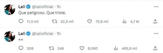 Luego, en la red social, donde acumula más de 7 millones de seguidores, Lali sentenció: "Que peligroso. Que triste".