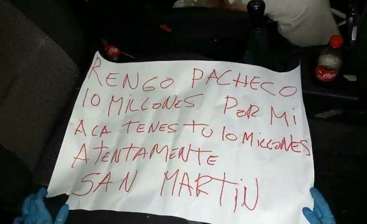 "Rengo Pacheco 10 millones por mi acá tenés tu 10 millones atentamente San Martín", afirma el mensaje escrito con tinta roja sobre un papel blanco encontrado sobre el asiento del acompañante de la camioneta Peugeot Partner blanca en la que estaba el cuerpo del policía, identificado como Ariel Ricardo González (35), quien se desempeñaba en la Delegación Mercedes de la División Unidad Operativa Federal (DUOF) de la PFA, aunque se hallaba de vacaciones en estos días, dijeron los voceros consultados por Télam.
