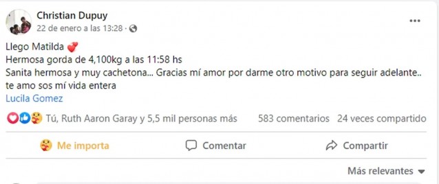 “Llegó Matilda. Hermosa gorda de 4,100kg a las 11:58 horas. Sanita, hermosa y muy cachetona… Gracias mi amor por darme otro motivo para seguir adelante”, escribió en su perfil de Facebook el papá del chico asesinado en La Pampa hace tres años.