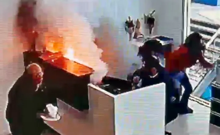 El estallido conmocionó a los tres presentes, según se puede ver. El fuego crece y se apaga solo en cuestión de segundos, aunque deja una densa estela de humo gris claro.