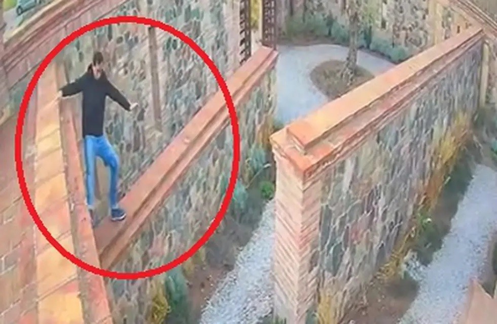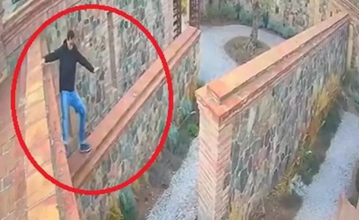 En las imágenes se ve que el hombre alcanza a saltar y apoyar un pie sobre el muro de abajo, pero pierde estabilidad y cae al piso, de espaldas.