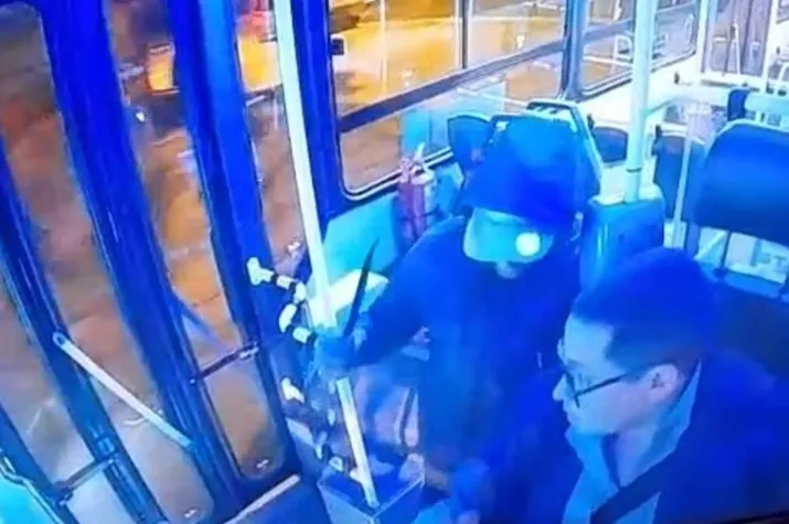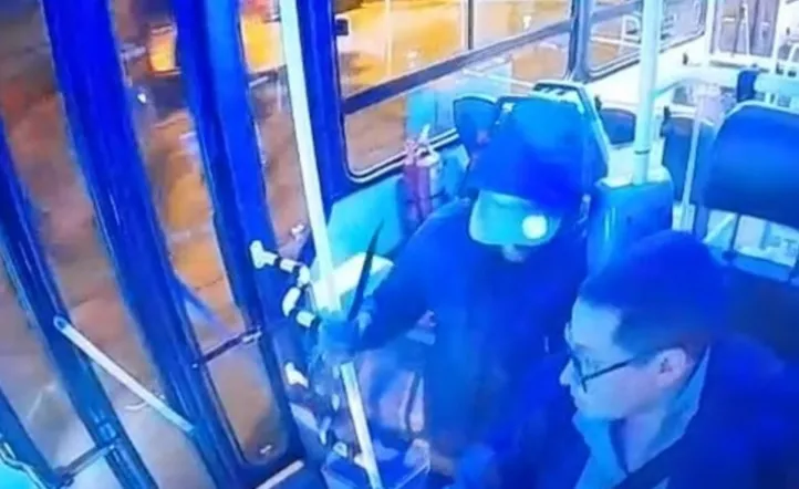 La siguiente secuencia está tomada por la cámara trasera del colectivo y se observa cómo el principal agresor del chofer se desplaza desde el fondo hacia adelante. Lleva una campera oscura y una capucha con gorra que le cubre en parte su fisonomía. Se nota que empieza a hablar con el chofer, hasta que un momento saca una cuchilla con su mano derecha del bolsillo y empieza a amenazarlo. Todo esto, con el ómnibus en movimiento.