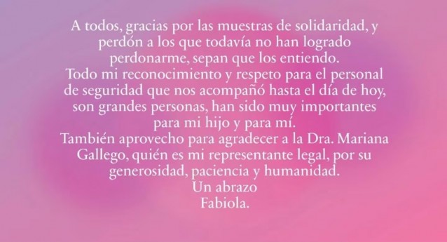 "También aprovecho para agradecer a la doctora Mariana Gallego, quien es mi representante legal, por su generosidad, paciencia y humanidad. Un abrazo. Fabiola", cerró.