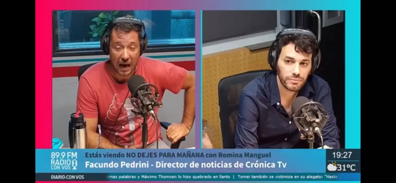 “Las pantallas y los medios que no participamos del negocio del país dividido tenemos un pacto de lealtad con lo que pasa con la gente. Crónica se convirtió en un auxiliar de justicia. Es el cuarto mostrador del Estado: la gente llama a la comisaría y no tiene a la respuesta, llama a la fiscalía y tampoco, incluso con un municipio no encuentra un paliativo, entonces llama al canal. Los que hacemos periodismo social debemos entender al país a través de los primeros planos. Hablan de a uno, están más atravesados por lo individual que por lo colectivo”, sostuvo Pedrini en el programa “No dejes para mañana” de Radio Con Vos (FM 89.9).