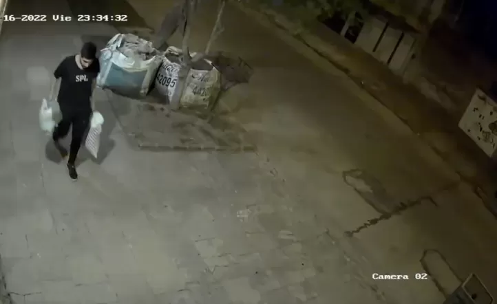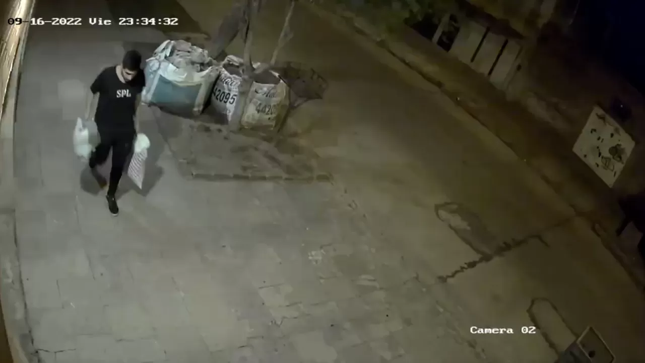 A la 0.40 vuelve a salir con la misma intención. Las bolsas desparramadas por todo el barrio siguieron y a las 2.49 repitió la escena.