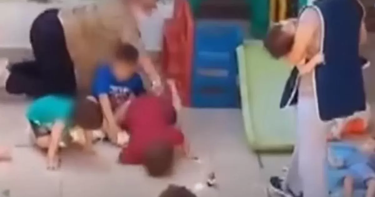 En las imágenes que se viralizaron, se puede ver como la mujer empuja y zamarrea a varios niños de entre uno y cuatro años y los levanta como si fueran bolsas, ante la mirada pasiva de una de las maestras del lugar.