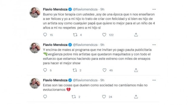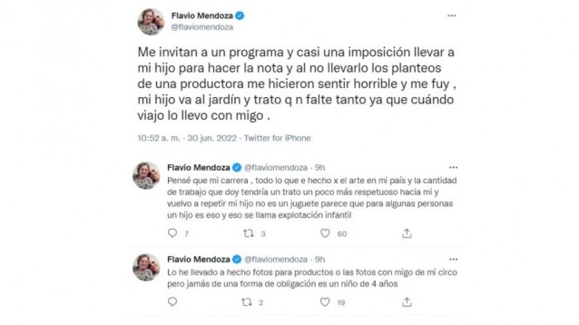 Mediante la red social del pajarito, Flavio Mendoza escribió: "Me invitan a un programa y es casi una imposición llevar a mi hijo para hacer la nota. Al no llevarlo, los planteos de una productora me hicieron sentir horrible y me fui. Mi hijo va al jardín y trato que no falte tanto, ya que cuándo viajo lo llevo conmigo".