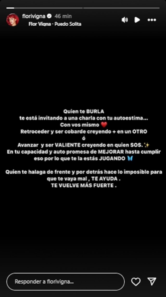 “Quien te burla te está invitando a una charla con tu autoestima. Con vos mismo”, aseguró. Y explicó que uno se debate entre: “Retroceder y ser cobarde creyendo más en un otro o avanzar y ser valiente creyendo en quién sos. En tu capacidad y autopromesa de mejorar hasta cumplir eso por lo que te la estás jugando”.